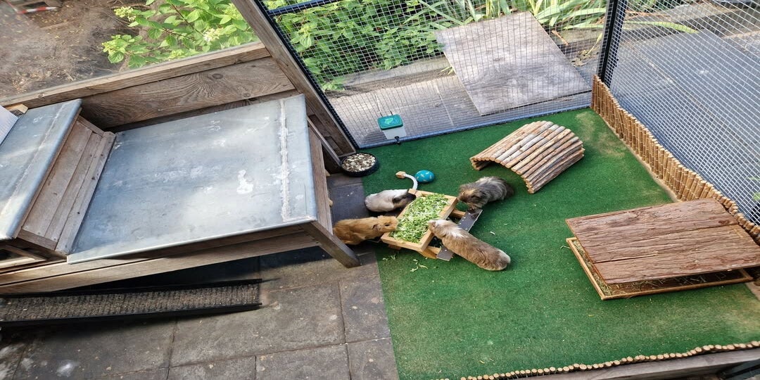 Cavia's buiten houden is natuurlijk heel anders dan dat ze binnen wonen. Ze zijn wat meer op zichzelf en elkaar gewezen. Zelf vind ik het groepsverband heel leuk om te zien omdat hun natuurlijke gedrag wat meer tot uiting komt. Maar ze komen net zo goed heel hard aanrennen als je wat lekkers voor ze hebt en ook melden zich ook hard piepend dat is iets wat ze gewoon blijven doen. Zo leuk!