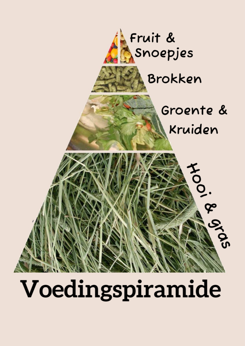 In deze afbeelding zie je de voedingspiramide. Dit is een handig hulpmiddel om je makkelijk en duidelijk te laten zien hoe het dieet van een cavia eruit ziet: